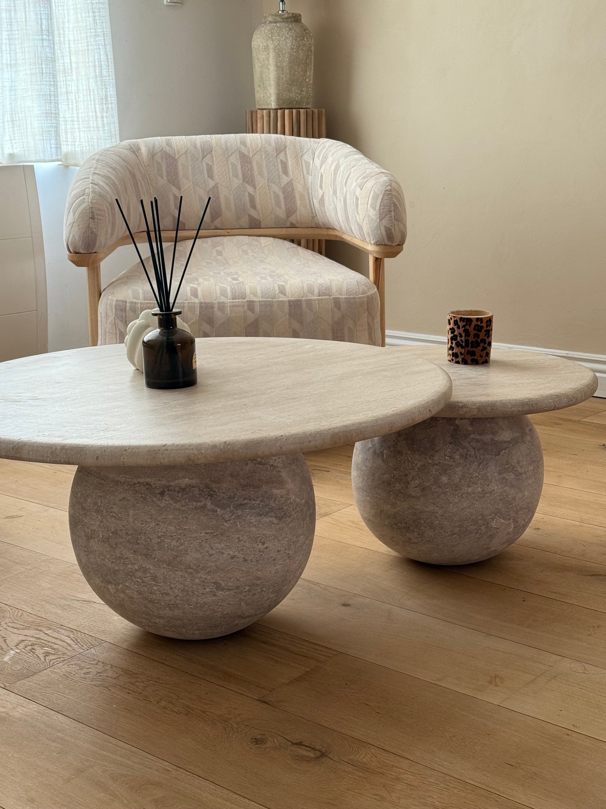 Fabriquées à la main en travertin de haute qualité, ces tables révèlent des nuances uniques et des veines authentiques, rendant chaque pièce absolument unique. Leur piètement sphérique audacieux contraste harmonieusement avec le plateau circulaire, créant un équilibre parfait entre modernité et authenticité.